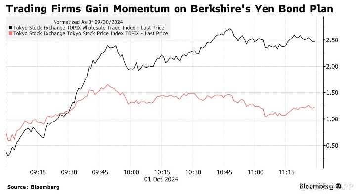 伯克希尔哈撒韦公司正计划今年第二次发行日元债券,引发市场猜测该公司寻求增加在日本的投资,日本商社类股票应声走高。