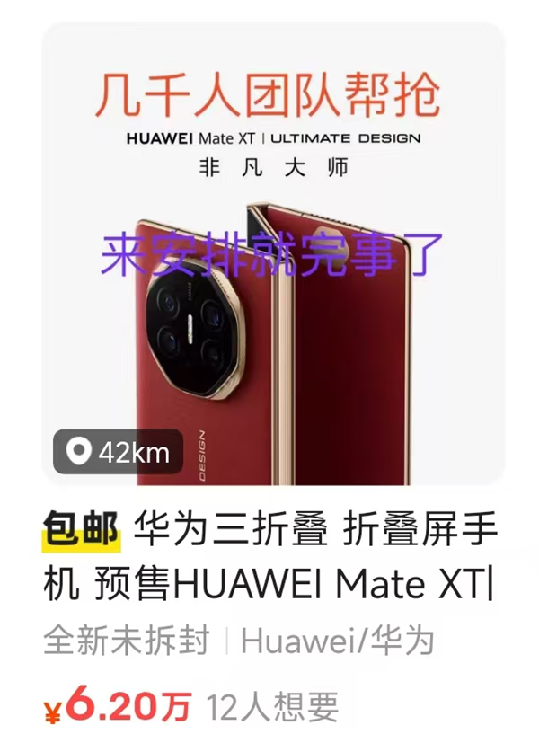 华为Mate XT开售前已受瞩目,售价两万三,官网预约近七百万。开售前咸鱼卖家加价两万以上且需预付定金,各种拿货渠道说法众多,行情复杂。