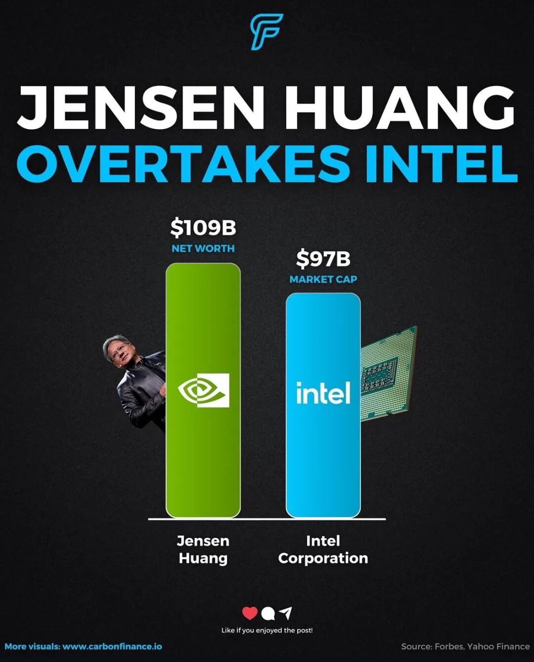 NVIDIA 首席执行官黄仁勋(Jensen Huang)的身价现已超过 NVIDIA 的宿敌英特尔(Intel)公司的总和,净资产达到 1090 亿美元。仅从纸面上看,根据英特尔的估值,黄仁勋本人就可以收购英特尔。