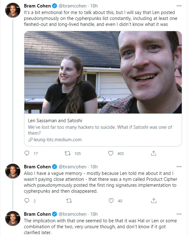 他的去世与世界上最著名的密码朋克——Satoshi Nakamoto 的消失不谋而合。在 Len 去世的前两个月,Satoshi 发出了他们的最后一次通信: