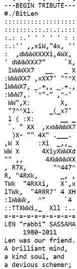 在每一个 Bitcoin 节点中,都嵌入了一则讣告。这则讣告被嵌入交易数据中,成为了对 Len Sassaman 的纪念——一个几乎被永生化在区块链上的人。这种纪念方式再合适不过了。