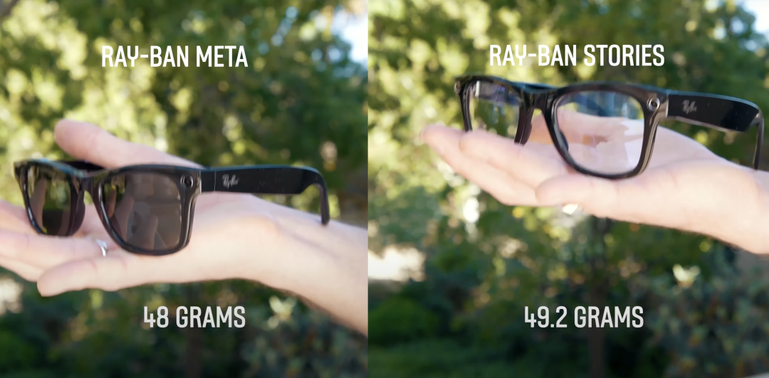 不过,只有像眼镜,还不足以奠定 Meta 眼镜今日的成功。Meta 与雷朋联名的初代产品,外观与今日的 Meta 眼镜几乎相同,官方重量仅多出 1.2g。