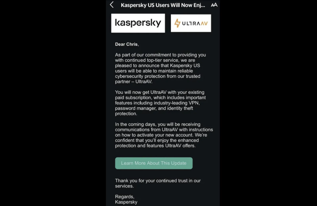 卡巴斯基关于 UltraAV 过渡的电子邮件