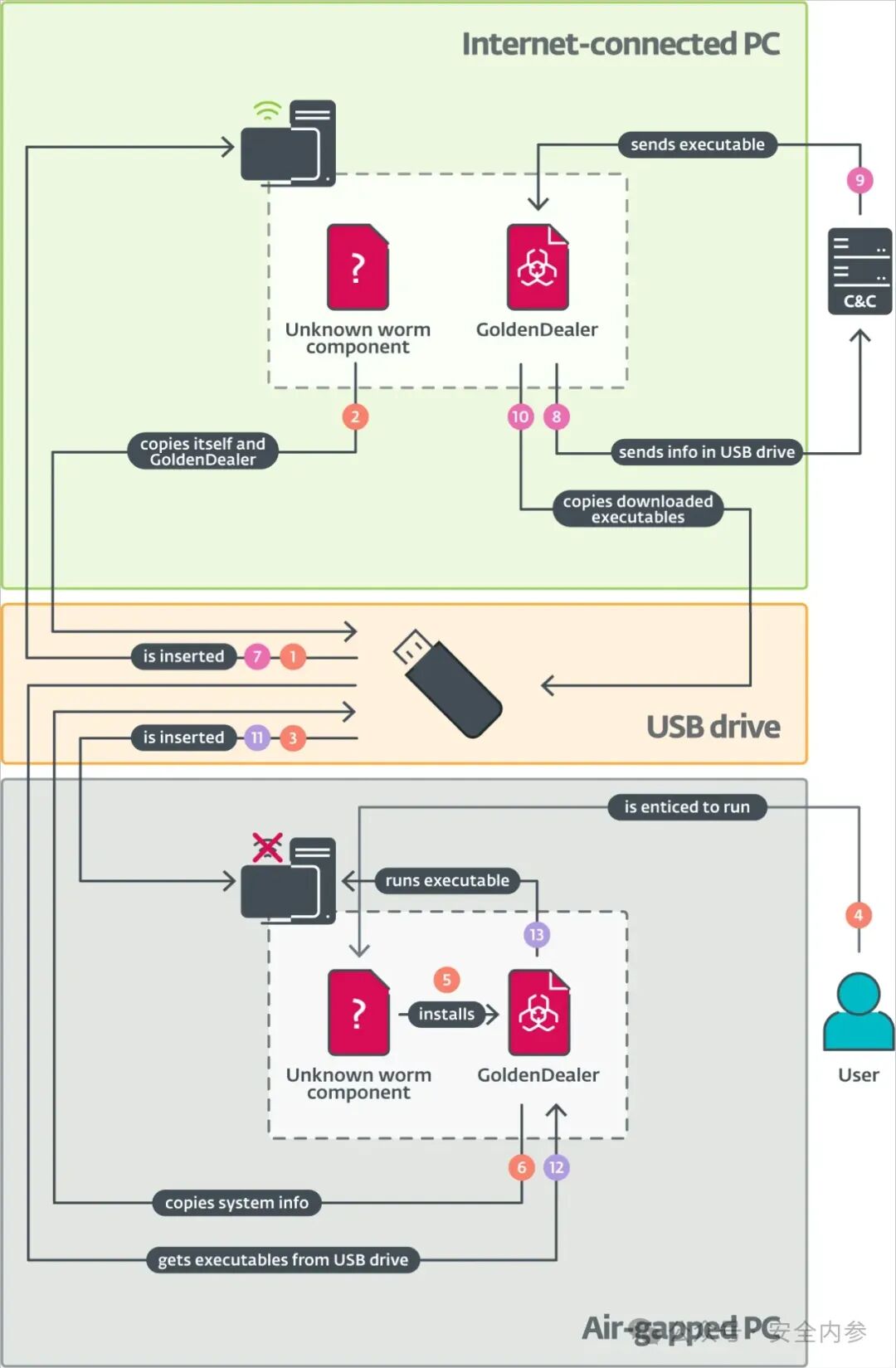 虽然早已知晓GoldenJackal通过USB闪存驱动器传播自定义工具,例如“JackalWorm”,但此前并没有确认过成功攻破气隙隔离系统的案例。
