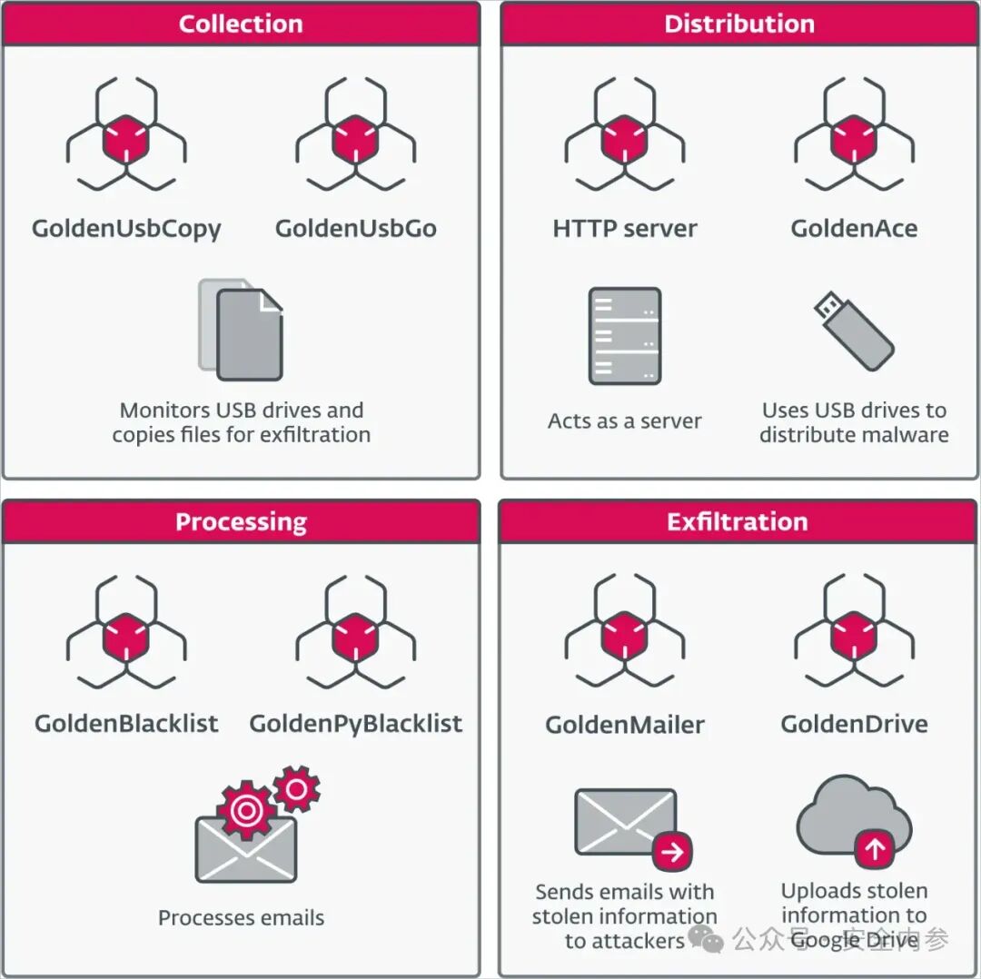 最后,GoldenMailer负责通过电子邮件将窃取的信息发送给攻击者,而GoldenDrive则用于将数据上传到Google Drive。
