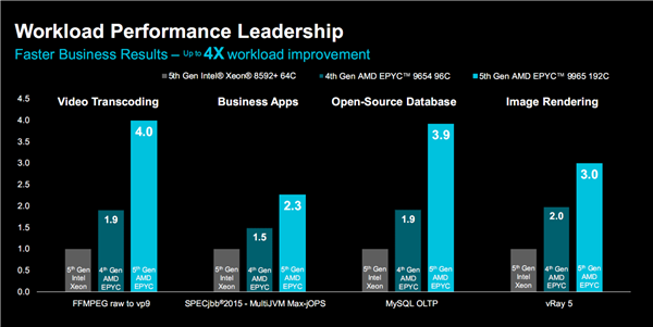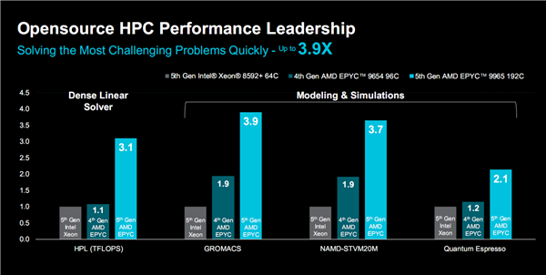 在不同的企业应用、HPC、AI等负载中,包括视频转码、图像渲染、商业程序、数据库、FEA(有限元分析)模拟、CFD(计算流体力学)模拟与建模、开源高性能计算、机器学习、端到端AI、相似性搜索、大语言模型等等,EPYC 9965都能做到遥遥领先。它不但对比上代有着质的飞跃,对比竞品64核心的至强8592+更是全程碾压,性能优势最高达4倍之多。