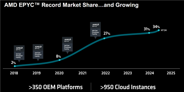 按照第三方市调机构的统计,第一代Naples EPYC 7001系列诞生之时,也就是2017年的时候,AMD在服务器市场上的份额几乎为零。加上第二代Rome EPYC 7002系列的连续积累,2020年时AMD已经收获了8%的市场,初步站稳了脚跟。之后,随着第三代Milan EPYC 7003系列的到来,AMD迎来爆发阶段,市场份额在2022年达到了惊人的27%。第四代EPYC更是达到了空前的高度,市场份额也稳步增加,截止到2024年上半年已经占到34%,也就拿下了三分之一的天下。