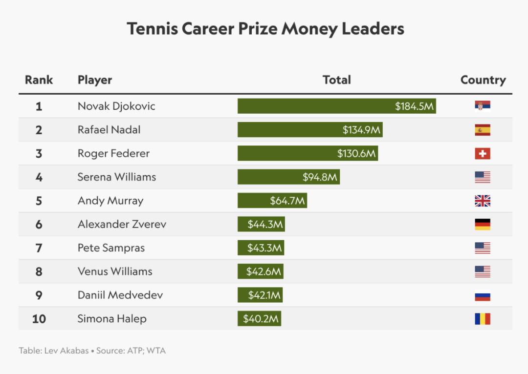 据体育商业媒体Sportico估计,纳达尔从赞助商、出场费中获得的收入估计可达4.25 亿美元。算上所得比赛奖金,纳达尔的职业生涯总收入可达到 5.6 亿美元。