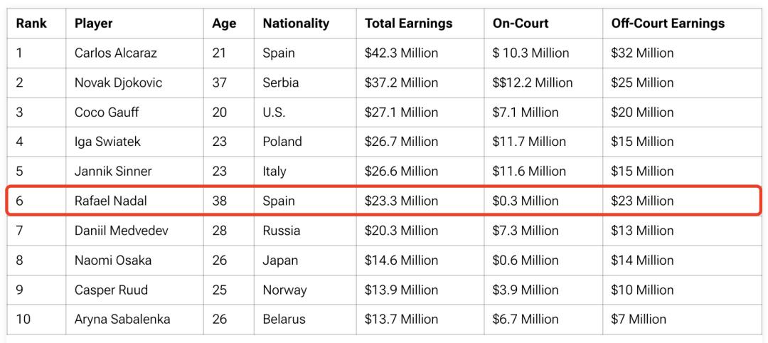 如此有限的赛事参与度会严重影响大多数运动员的收入,尤其是在网球领域,赞助商通常会降低排名下滑或缺席比赛球员的赞助费。可实际情况是,过去一年,纳达尔的收入还是达到了惊人的2330万美元,超过了绝大多数网球运动员,排名2024年网坛收入榜单第6位。