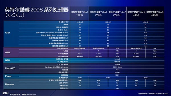 此外,首次引入桌面级处理器的AI加速能力,全新Xe-LPG架构的核显,以及更低的游戏中核心温度(降低约10℃),使得Arrow Lake平台能够为用户带来更好的使用体验。·首发阵容及规格英特尔酷睿Ultra 200S系列处理器首发包含酷睿Ultra 9 285K,酷睿Ultra 7 265K,酷睿Ultra 7 265KF,酷睿Ultra 5 245K以及酷睿Ultra 5 245KF五个型号,具体规格与首发价格如下图所示: