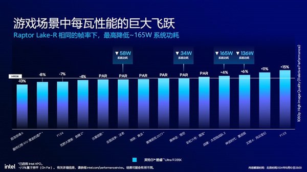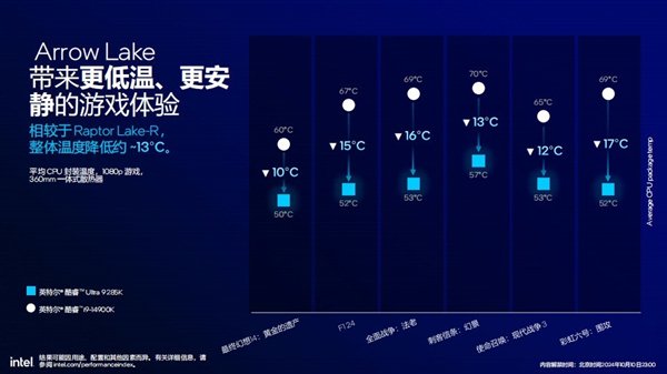 🎮 **游戏体验**:Arrow Lake在游戏方面着重于能效表现,相比上一代,相同帧率下系统功耗最高降低165W。在多款游戏测试中,Arrow Lake处理器的功耗都有不同程度的降低,并带来更低的温度,整体温度降低约13℃。虽然游戏性能略微降低5%,但换来了更低的功耗和温度,提升了游戏体验。