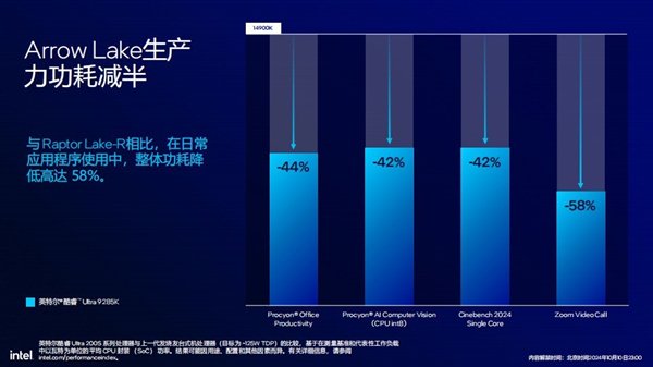 首先要明确的一点是,相比以往一味地去提升性能,Arrow Lake设计的主要目标是降低能耗,同时确保性能得到提升。那么Arrow Lake的能效表现如何呢?对比上一代Raptor Lake-R,在日常应用中,Arrow Lake整体功耗降最高降低了58%,另外在UL Procyon Office生产力、CPU int8、CINEBENCH 2024单核性能方面,功耗也分别降低了44%和42%。