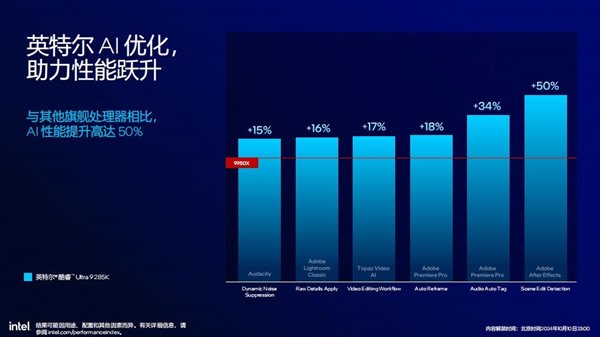 💻 **生产力与AI性能**:Arrow Lake在生产力应用方面拥有显著优势,在视频编解码、多线程性能、8K播放与渲染等方面大幅领先竞品。得益于指令集拓展,Arrow Lake的AI性能提升显著,AI算力相比上一代大幅提升,最高高出竞品50%。同时,NPU的引入扩展了AI计算类型,降低了CPU和GPU的AI计算负载,帮助系统节约能耗。