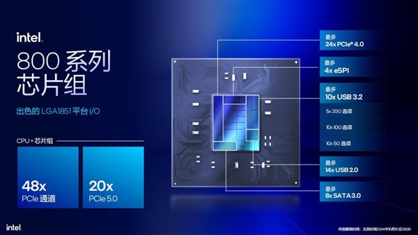 🌐 **芯片组、连接、超频、内存**:Arrow Lake平台采用了全新的LGA1851接口,并推出了全新的800系列芯片组,支持48条PCIe4.0通道和20条PCIe5.0通道,以及更多USB接口和更高规格的连接特性。该平台还留下了较大的超频余量,支持DDR5 6400规格,每DIMM插槽最高支持48GB容量,总容量支持到192GB。