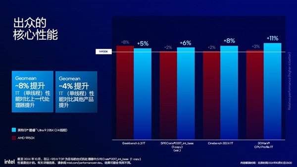 在核心性能方面,Arrow Lake与竞品相比也处于领先地位。参考酷睿Ultra 9 285K以及AMD锐龙9 9950X的单线程性能表现,并且以上一代酷睿i9-14900K的单核性能为参考基准,Arrow Lake最高提升11%,最低提升5%。在Geekbench 6.3单核性能测试上不及锐龙9 9950X,但在SPECrate 2017、CINEBENCH 2024、3DMark CPU Profile单线程性能测试上均领先竞品4-8个百分点。