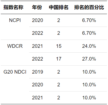 中国网络能力和数字竞争力较强。在对国家网络能力或数字能力进行全面评价的主要指数(见表3)中,中国的排名均处于较靠前的位置。在NCPI和G20 NDCI中,中国保持世界第2的位置,均在前10%以内,处于第一梯队;在WDCR中,中国位于中上游,排名均在前30%。