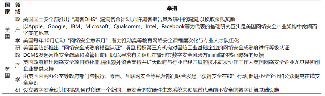 根据GCI的评估结果,美国、英国、韩国、新加坡、西班牙等19个国家在能力发展维度得分最高,在公众网络安全意识宣传活动、网络安全专业人员培训、网络安全教育项目、网络安全研究与发展计划、国家网络安全产业、政府激励机制方面[2],基本实现了全面覆盖。为充分发挥产业、学校、科研机构等不同组织机构优势,形成强大、先进的研究、开发、生产一体化系统[9],不断丰富积累网络安全资源储备,全球主要国家(如美国、英国)都采取了“政产学研”等方面举措[10](见表6)。具体来看,“政”主要是指通过政府激励机制搭建网络安全技术应用发展平台,“产”主要是指发展网络安全产业的政策举措,“学”主要是指推动网络安全专业人才培养和技能培训、公众网络安全意识提升等,“研”主要是指推动网络安全技术发展以及产品服务研发应用。