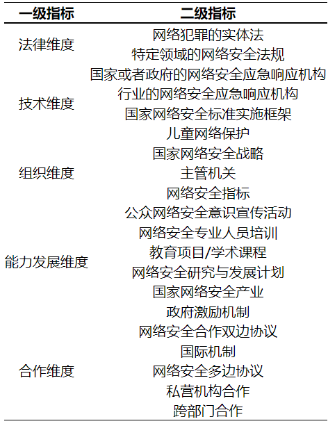 此外,还有总部位于伦敦的经济学人智库(Economist Intelligence Unit,EIU)于2011年发布的网络力量指数(Cyber Power Index,CPI)、美国波托马克政策研究所于2015年发布的网络就绪指数2.0(Cyber Readiness Index 2.0,CRI 2.0),这两个指数由于年代比较久远,本文不予纳入分析。英国国际战略研究所(International Institute for Strategic Studies,IISS)于2021年发布了《网络能力与国家力量:净评估》[4]报告,从战略与学说,治理、指挥和控制,核心网络情报能力,网络赋权与依赖,网络安全与弹性能力,网络空间事务的全球领导力,进攻性网络能力7个方面对15个国家的网络能力进行了定性评估,考虑到评估的国家比较有限,在本文中不予纳入分析。