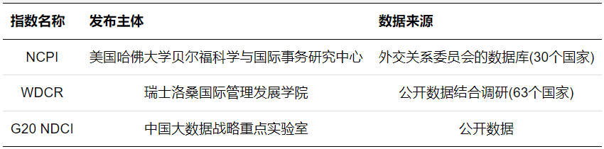 目前,全球知名的网络能力与数字竞争力相关指数主要有3个(见表2),包括国家网络能力指数(National Cyber Power Index,NCPI)、全球数字竞争力排名(World Digital Competitiveness Ranking,WDCR)和G20国家数字竞争力指数(National Digital Competitiveness Index,NDCI)。从指数的来源机构看,NCPI、WDCR和G20 NDCI分别源自美国哈佛大学贝尔福科学与国际事务研究中心、瑞士洛桑国际管理发展学院和中国大数据战略重点实验室。从指数的发布时间看,NCPI分别于2020年、2022年发布了两次;WDCR和G20 NDCI则分别从2017年、2020年起每年发布。从对指数的评测情况看,3个指数各有侧重,在评估一国的网络能力与数字竞争力方面可互为补充。其中,G20 NDCI的二级指标数字安全能力主要涵盖制度安全、设施安全、技术安全3个维度,数据来源于ITU的GCI、世界银行的世界发展指标(World Development Indicators,WDI)数据库以及公开资料。