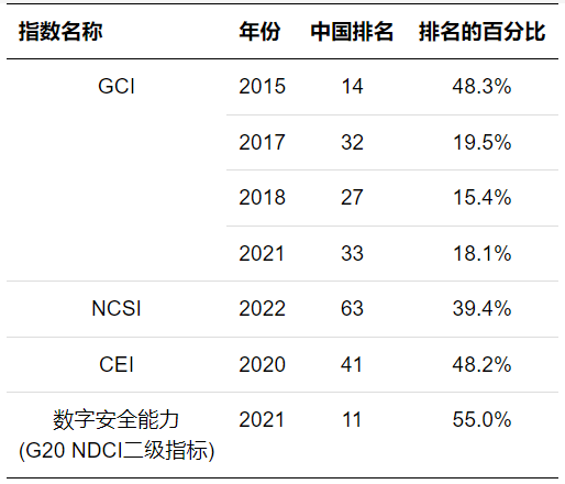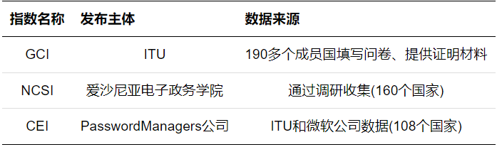 在上述这些指数中,从来源机构看,GCI、NCSI和CEI分别源自国际组织、非营利性基金会以及私营企业。从评测情况看,GCI和NCSI是从网络安全管理和发展的维度来评估某国的网络安全能力,GCI的指标设计和数据来源较NCSI更全面,CEI则主要根据网络安全事件发生的情况来进行反向评测。
