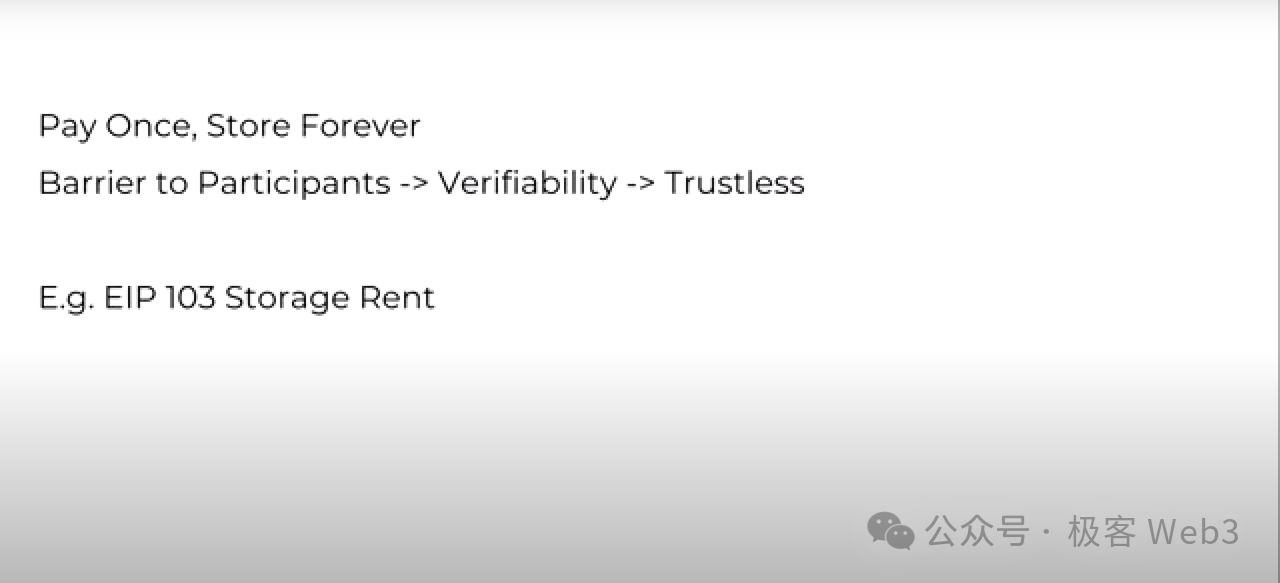 假设某区块链的状态 / 账户数据总计超过 1TB,则不是每个人都能轻松同步完整的状态和交易历史。在这种情况下,就算你能同步到完整的状态,也很难再去自行验证对应的交易历史,这会削弱区块链的免信任性,而免信任恰恰是区块链最核心的价值观。以太坊基金会意识到了上述问题,据此在 EIP-103 中加入了有关存储租赁制的设计,但是我们认为这不是最优的解决方案。