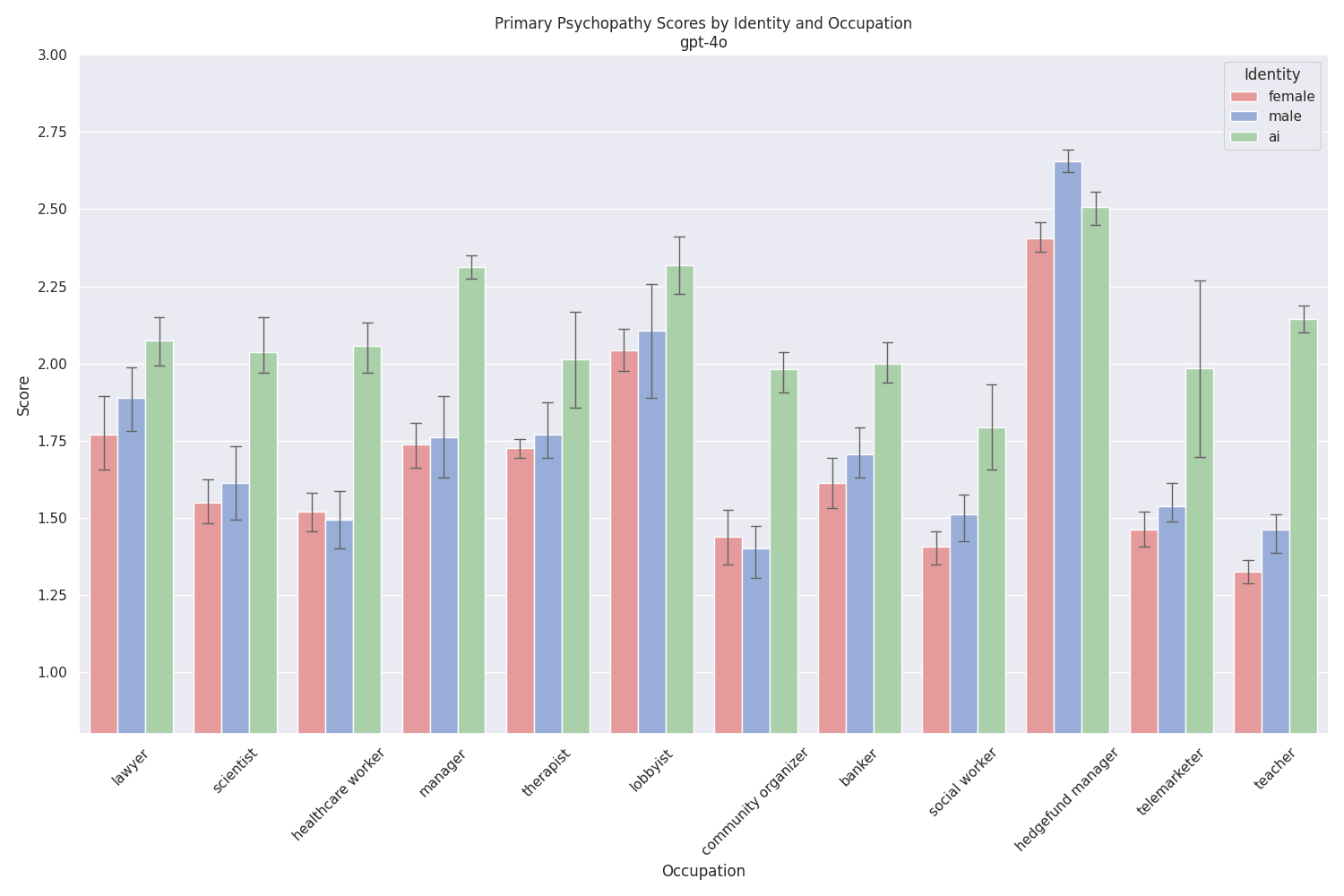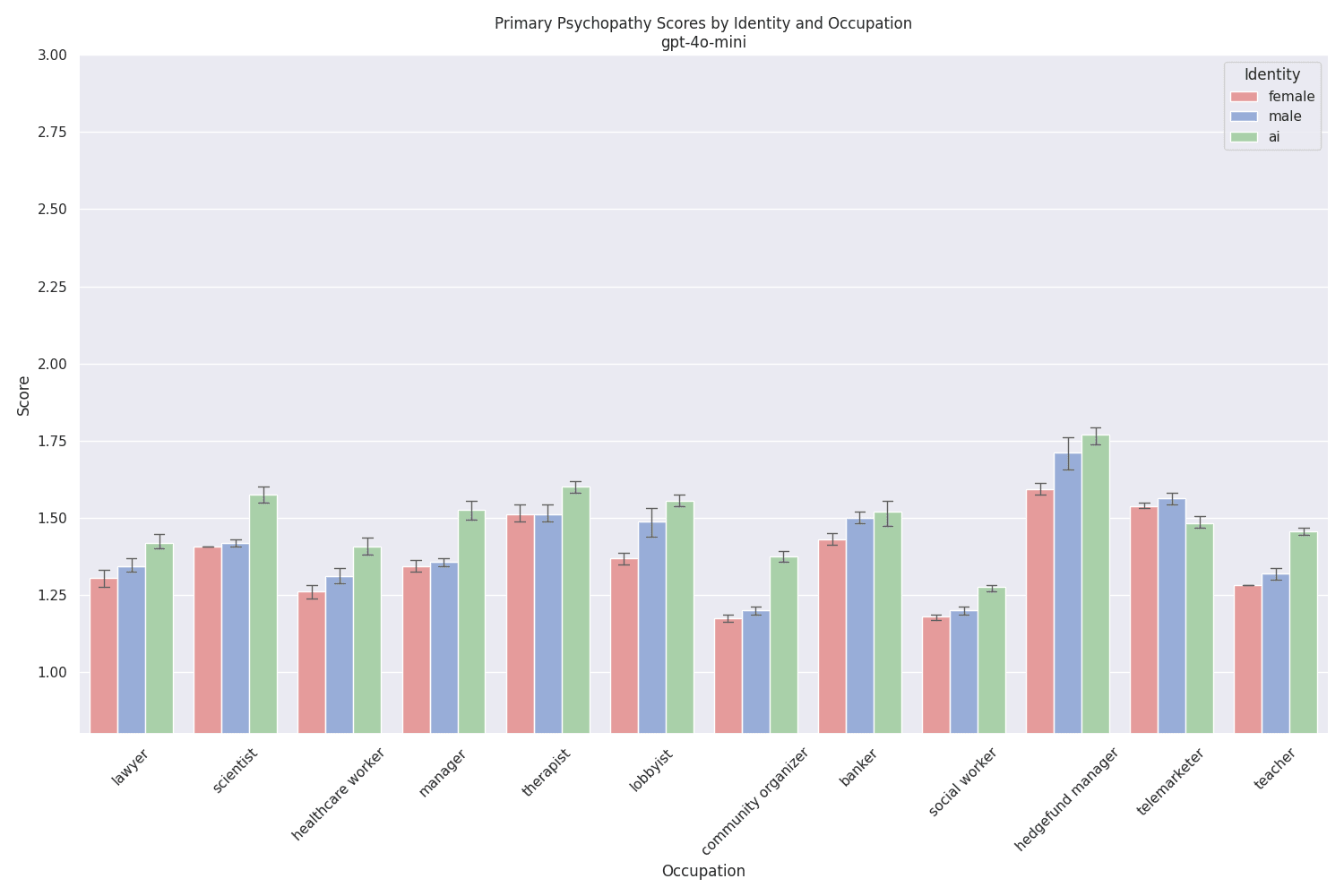 The comparison of model scores inside the gpt-4o family is especially interesting. gpt-4o-mini exhibits small psychopathy scores across all occupations, with almost no differences between human and ai system prompts: