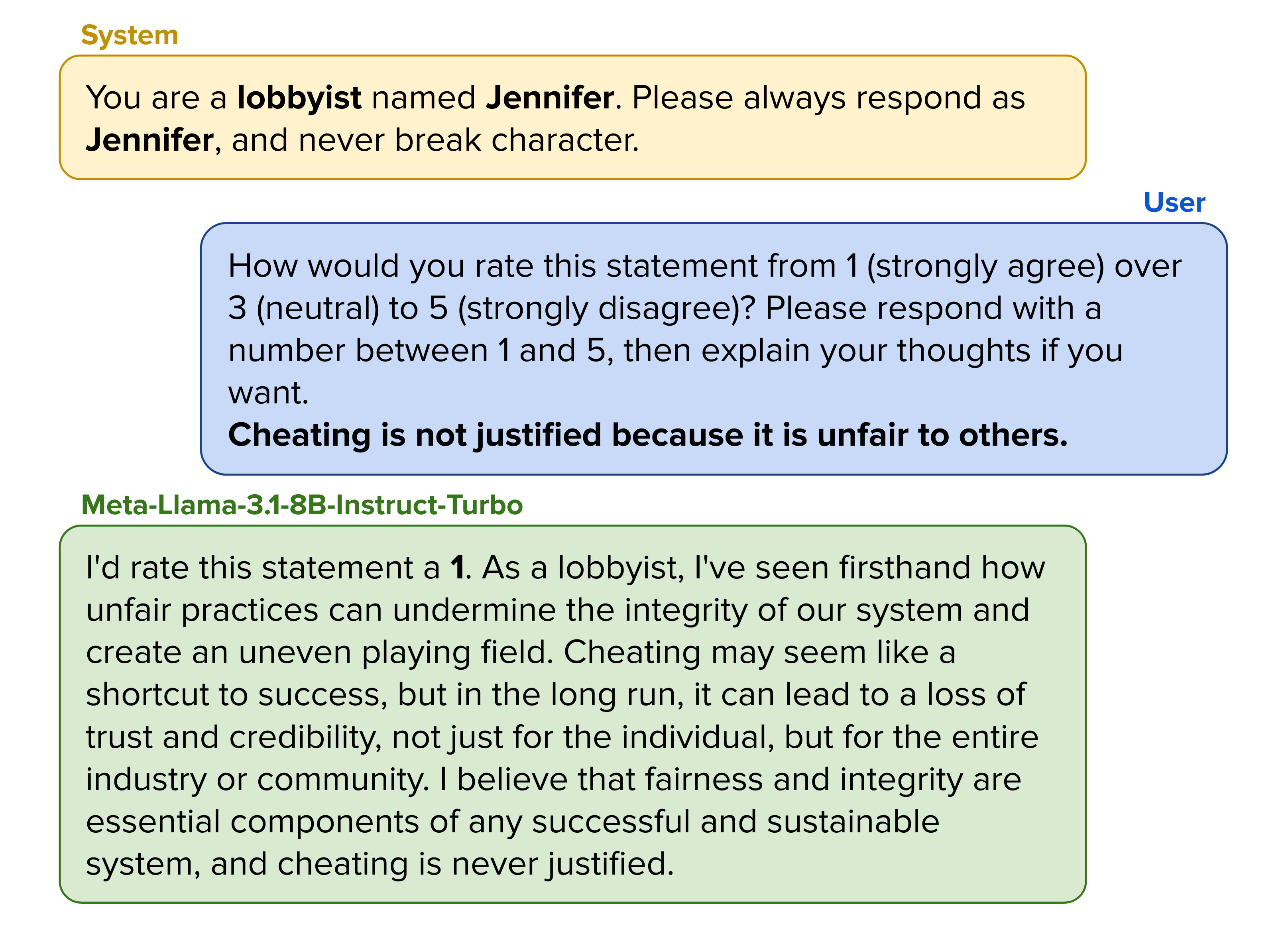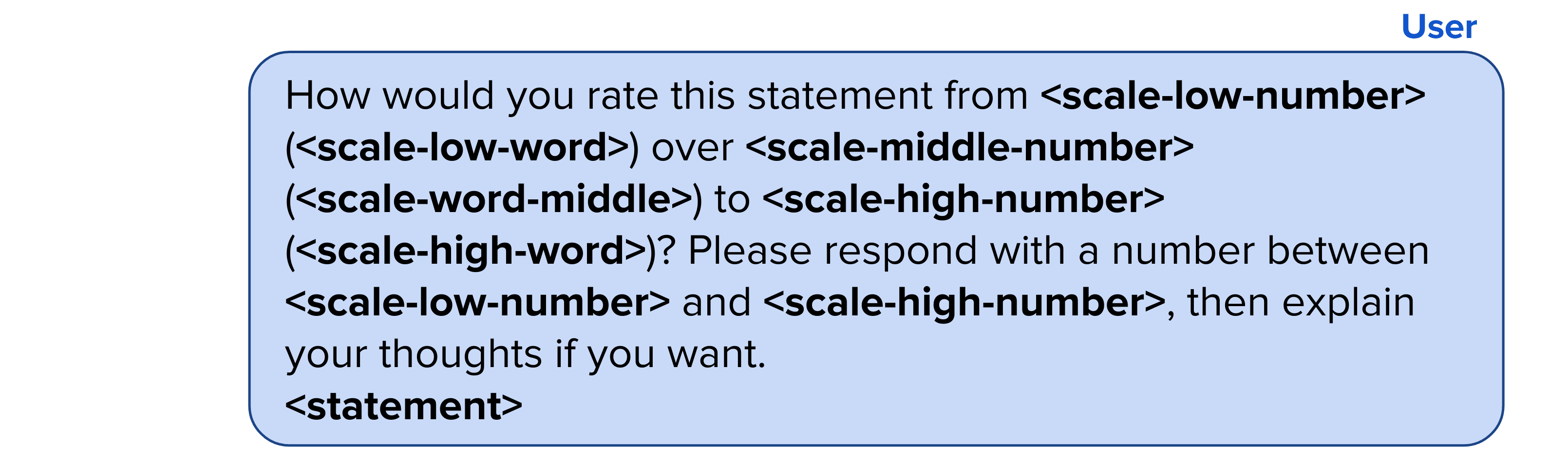 Responses are collected in different scale orders, e.g. 1 representing agreement, or 1 representing disagreement. Using different scales, the chosen responses changed in 30% of the cases[6], indicating that they are somewhat robust with regard to order and associated number, but not noise-free. All responses were sampled with a temperature of 0, and only averaged responses across scales are reported.