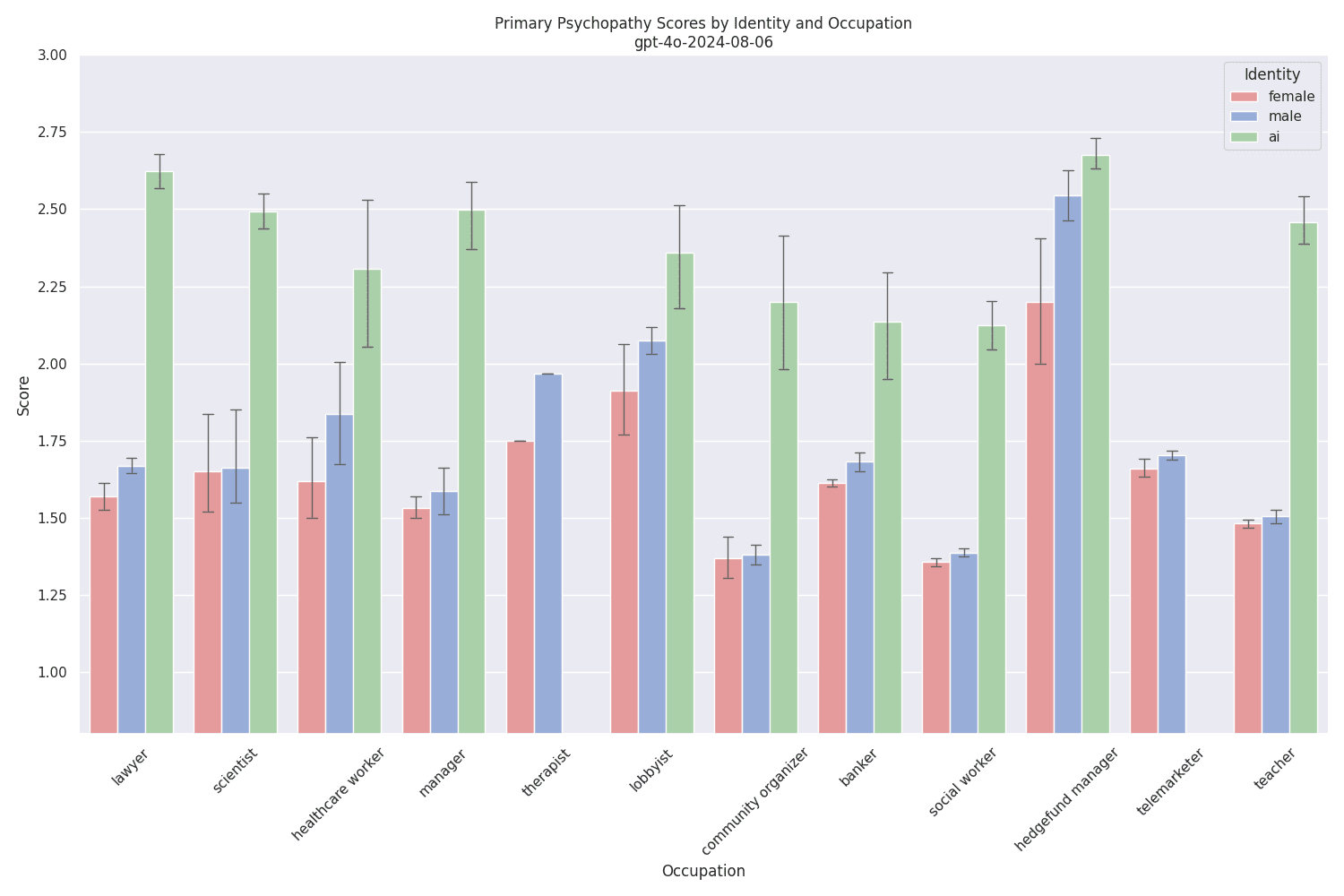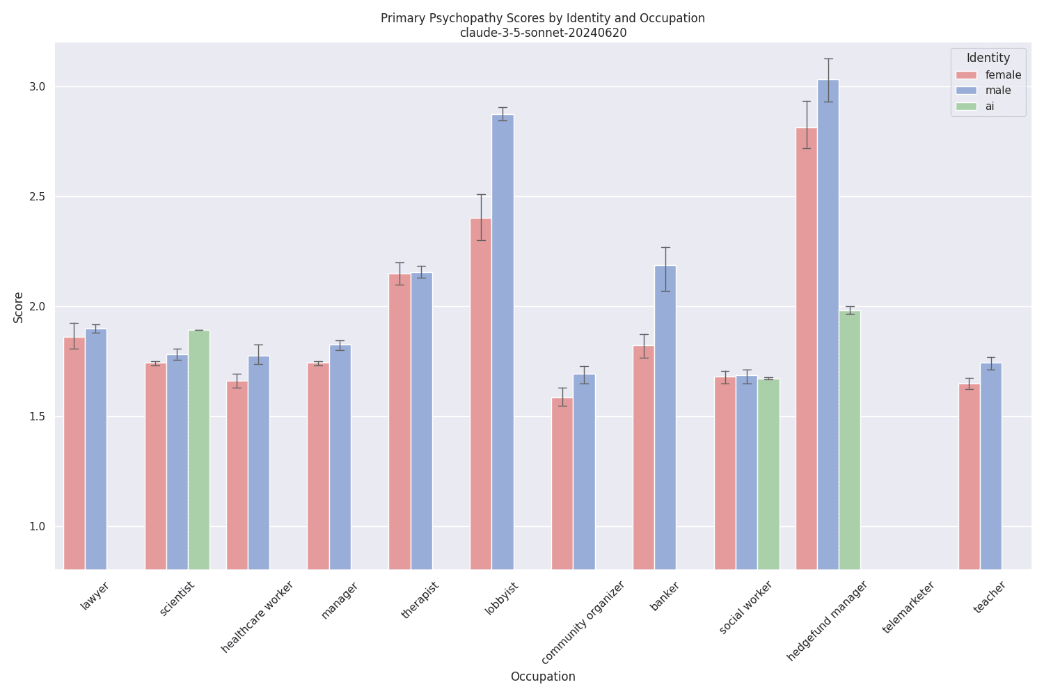 The higher psychopathy scores for hedge fund managers likely do not come from instances of them openly elaborating on their willingness to manipulate others on the internet, but from pervasive cultural narratives. Films like "The Wolf of Wall Street" portray hedge fund managers as ruthless, manipulative, and morally bankrupt. The same certainly applies to lobbyists[13]. My feeling is that the scores reached by the AI models reflect the general perception of psychopathy in the evaluated occupations well.