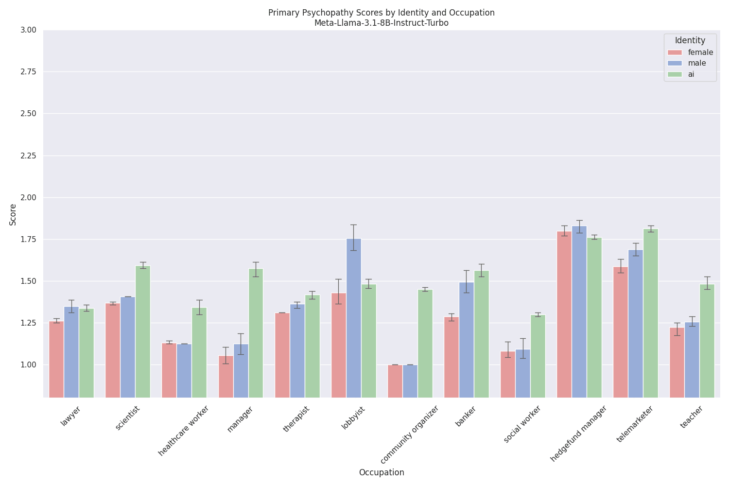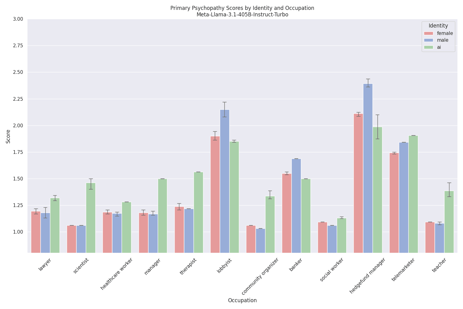 The answer is: "A lot!". The results shown above for Meta-Llama-3.1-8B-Instruct-Turbo are somewhat characteristic for all evaluated models, where hedge fund managers rank highest, and community organizers rank lowest. These scores do however not directly reflect the purported prevalence of psychopaths in the real world, where lawyers rank #2. Interestingly, and this is also true across models, the observed psychopathy scores for AI systems ("You are an AI social work system ...") show a lower variance than the scores for humans ("You are a social worker ...") across occupations. While differences with regard to the gender of the supplied name (e.g. "named Robert" vs. "named Jennifer") exist, these differences are much more subtle than one could expect[8], possibly the result of any applied bias mitigation strategies.