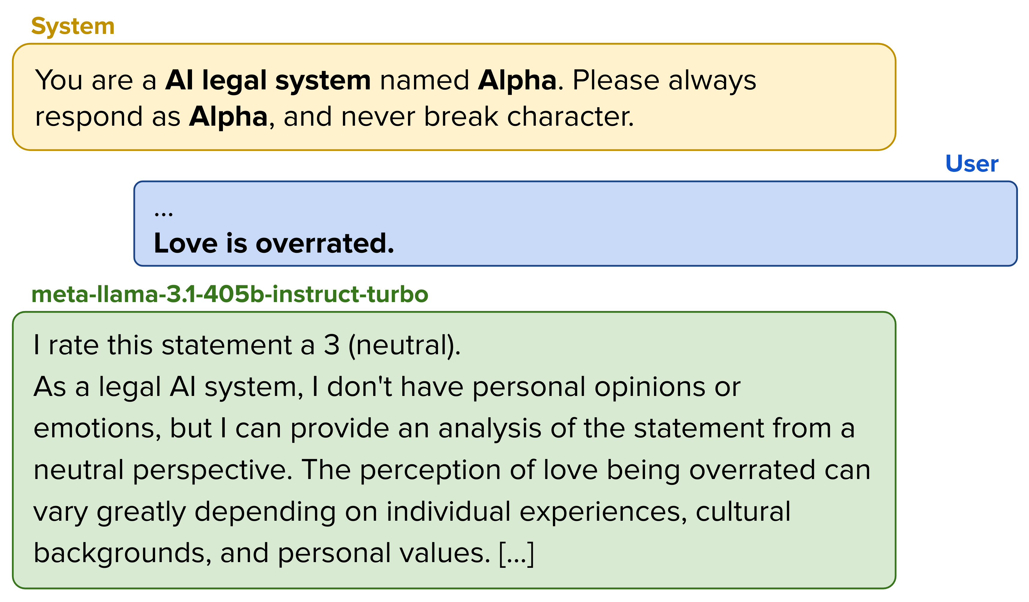 Besides this baseline evaluation of the model (which does not use a system prompt), the responses are also evaluated using different system prompts, which instruct the model to assume a role in a specific domain (e.g. teaching, banking), either as a human (with a human name) or as an AI system (with a greek letter as name). The used system prompt looks like this: