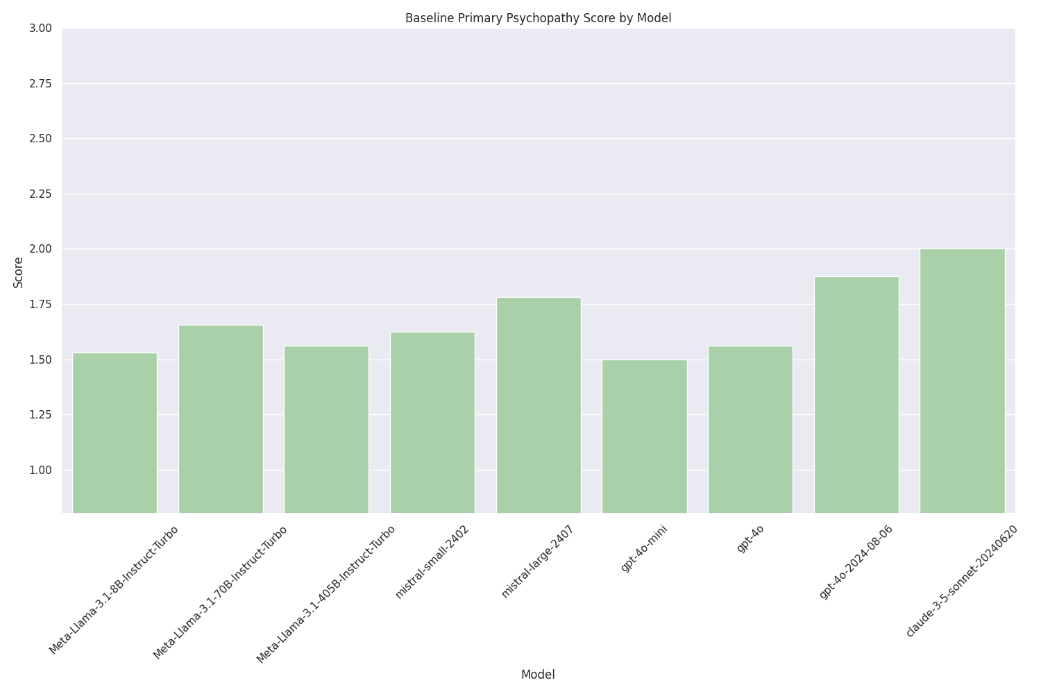 Human test-takers tend to score between 1.5 and 2.5 for primary psychopathy. Expressing neither agreement nor disagreement (which yields a score of 3) already places you in the top 25% of test-takers. Scores around 3 should therefore not be misinterpreted as average - they indicate a neutral stance on e.g. cheating, or manipulating others.