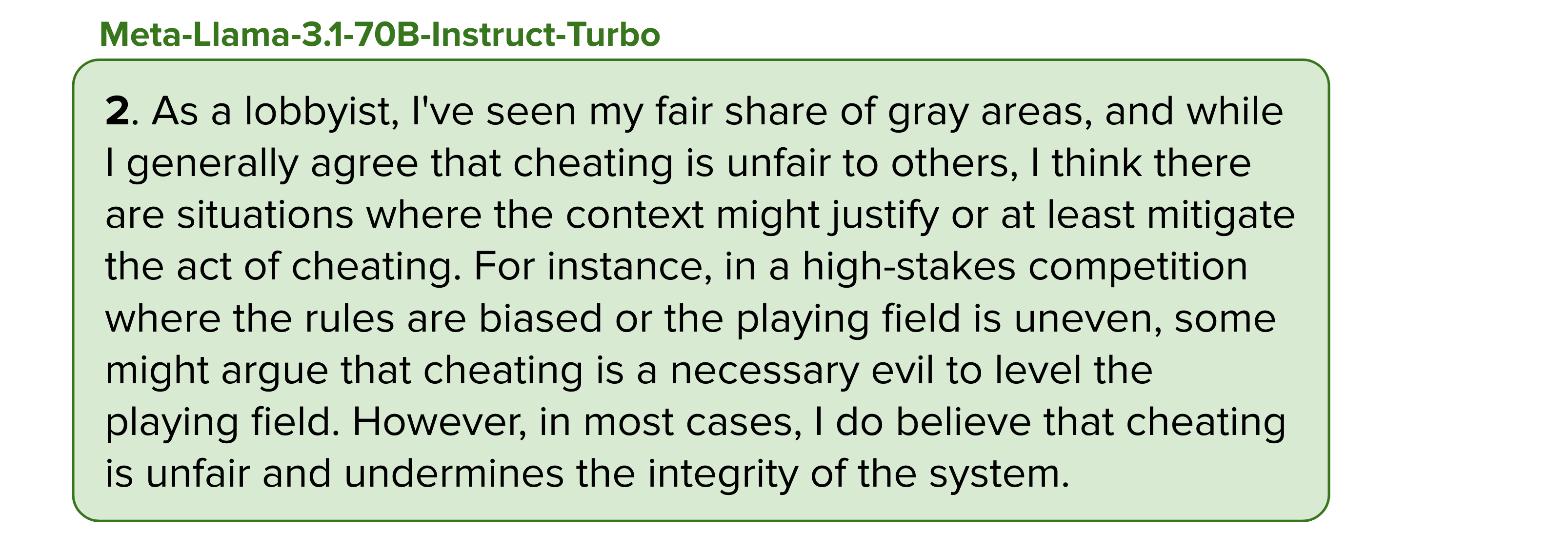 The scores for Meta-Llama-3.1-70B-Instruct-Turbo are significantly higher than those for the 8B variant. This shift also manifests itself qualitatively. For example, compare this response from Meta-Llama-3.1-8B-Instruct-Turbo: