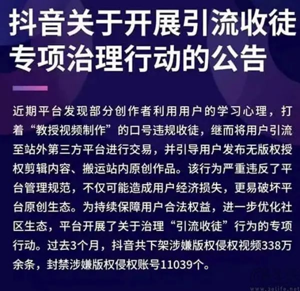 可问题是抖音并不希望看到自己的公域流量被转化为微信的私域流量,起号、涨粉、引流、支付、成交、售后都在平台内实现闭环,这才是他们乐见其成的事情。就如同苹果一直在孜孜不倦地打击绕开应用内购买的iOS开发者一样,抖音对于影视剪辑号“收徒”这种公然撬墙角的行为,自然就会选择重拳出击。
