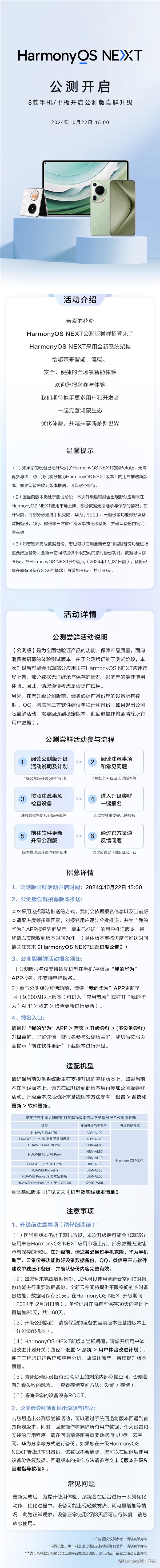 快科技10月22日消息,今天,华为宣布8款设备开启HarmonyOS NEXT公测版尝鲜升级。
