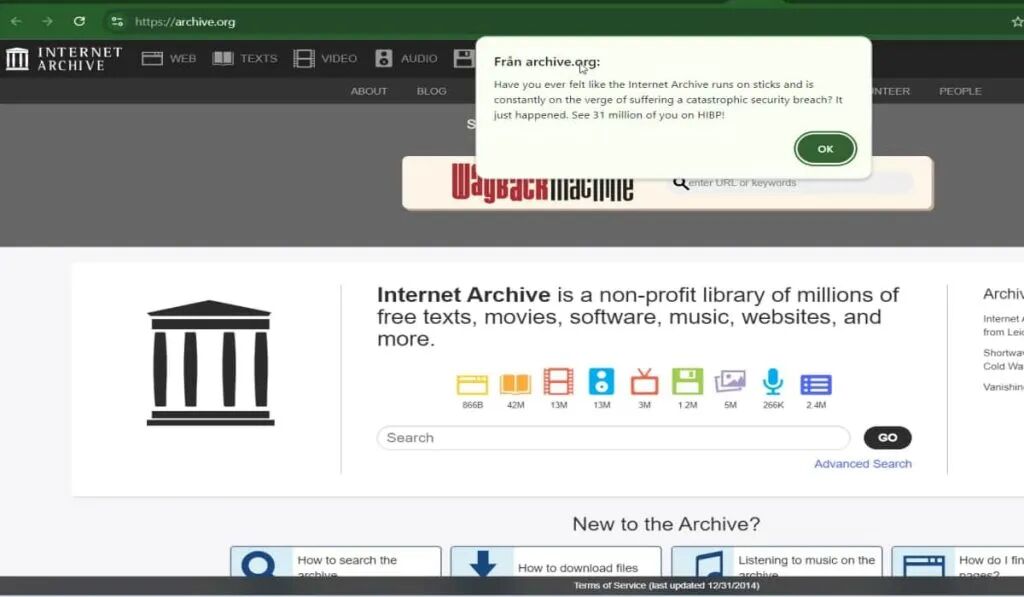 2024年10月,互联网档案馆经历了一系列网络攻击。最初的攻击发生在10月9日,包括数据泄露和分布式拒绝服务(DDoS)攻击。黑客通过在互联网档案馆的网站上发布消息,嘲讽其安全漏洞,并在“我是否被黑”网站(HIBP)上公布了被盗数据。
