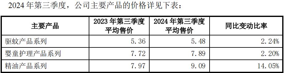 除此之外,润本股份还披露了主要产品的售价信息。可见的是,在2024年第三季度,驱蚊、婴童护理、精油系列产品的平均售价均有所上涨,分别同比上浮2.24%、2.2%以及14.05%。