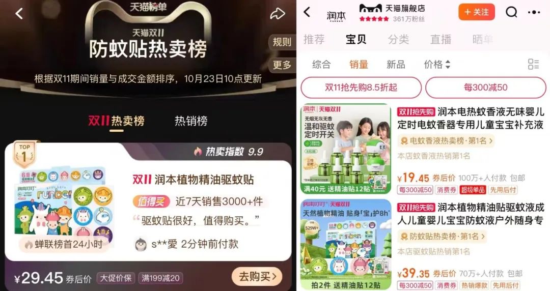 值得一提的是,该精油贴产品上了天猫双十一防蚊贴热卖榜第一名 (根据双十一期间销量逾成交金额排序,10月23日9点更新) 。