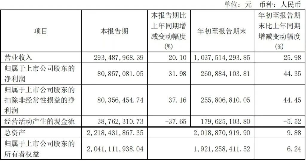 财报显示,润本股份2024年第三季度实现营业收入2.93亿元,同比增长20.10%。在净利润方面,实现归属于上市公司股东的净利润同比增长31.98%至8085.71万元;实现归属于上市公司股东的扣除非经常性损益的净利润8035.65万元,与上年同期相比,实现了37.16%的大幅增长。