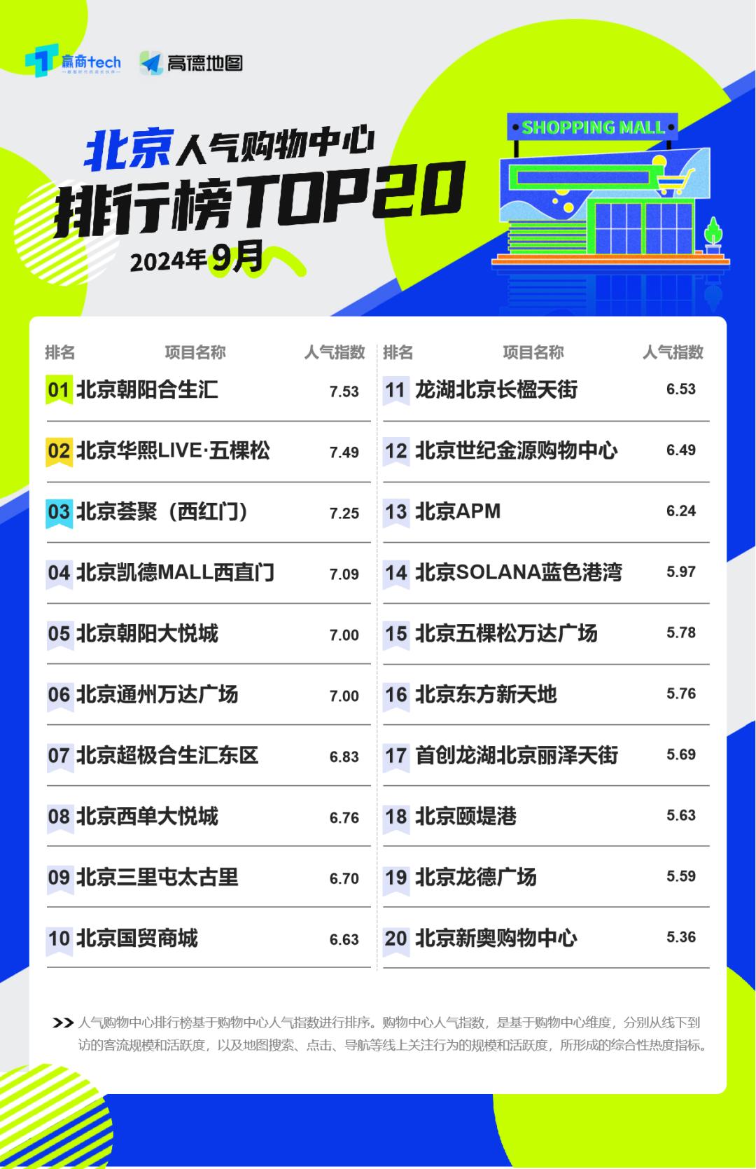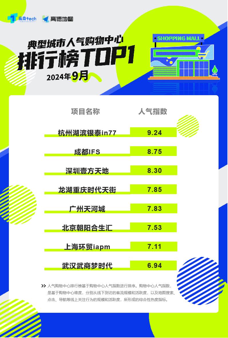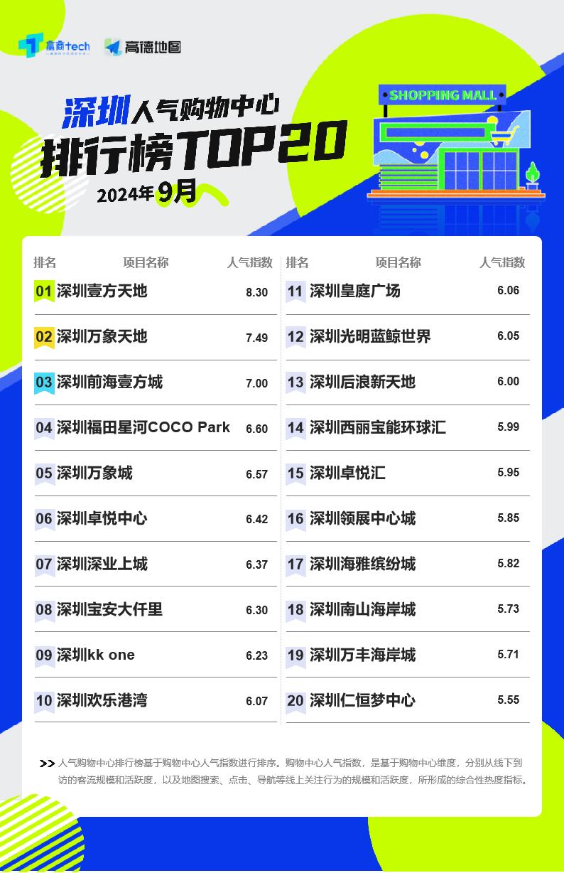 榜单排序基于“购物中心人气指数”,综合测评线下到访客流规模、活跃度,及地图搜索、点击、导航等线上关注行为的规模和活跃度,形成综合性热度指标,以量化数据为项目调改、品牌选址等给予参考,提升行业数智化决策效率。