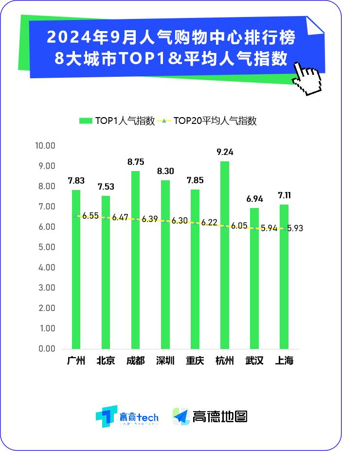 本榜单中,杭州人气购物中心TOP20的平均人气指数6.05,在8大城市中排名第6,稍有落后,但杭州的TOP1杭州湖滨银泰in77拿下了本月人气购物中心MVP,以9.24的优秀表现成为所有上榜人气购物中心当中唯一一个超过9分的选手。