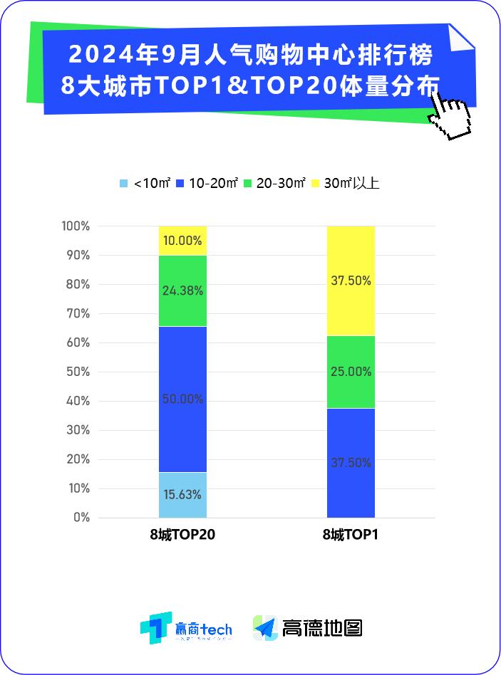 本榜单TOP1体量均在10万㎡以上,30万㎡的“巨无霸”Mall占比高达37.5%,20万㎡以上项目占比亦远超上榜项目整体水平。