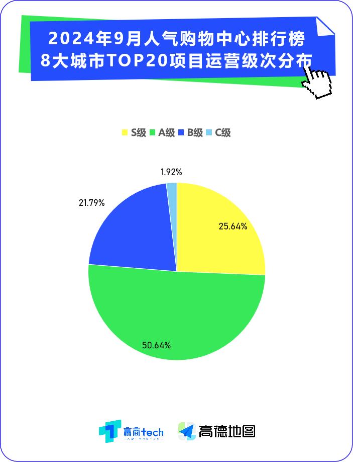 人气指数与项目运营级次密切相关。160个人气购物中心各凭本事上榜,运营级次整体较高,S级、A级项目占比高达76.3%,而在全国6800+购物中心中,这类项目占比仅在5%左右。