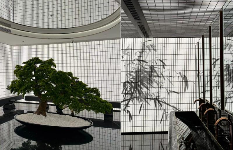 说是厕所,看着像中式庭院。水墨黑白色调,法拉利红点缀做桌椅;还有盆景、古松、细石,加上天圆地方的设计。