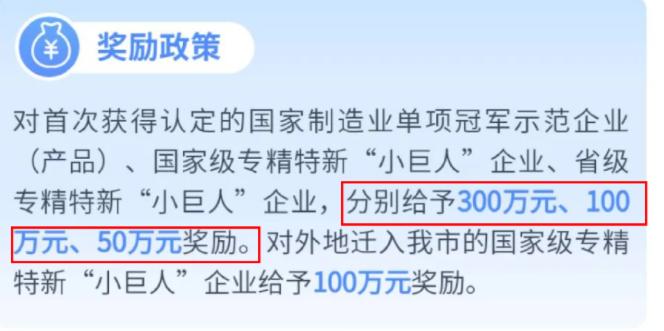 专精特新“小巨人”企业的奖励从50万到300万,外地迁入的还要再奖励。
