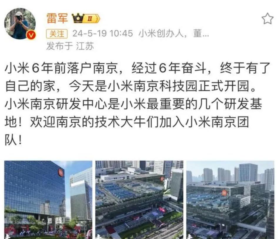 今年小米华东总部落户南京,雷军不仅现身南京,也在个人微博写道: