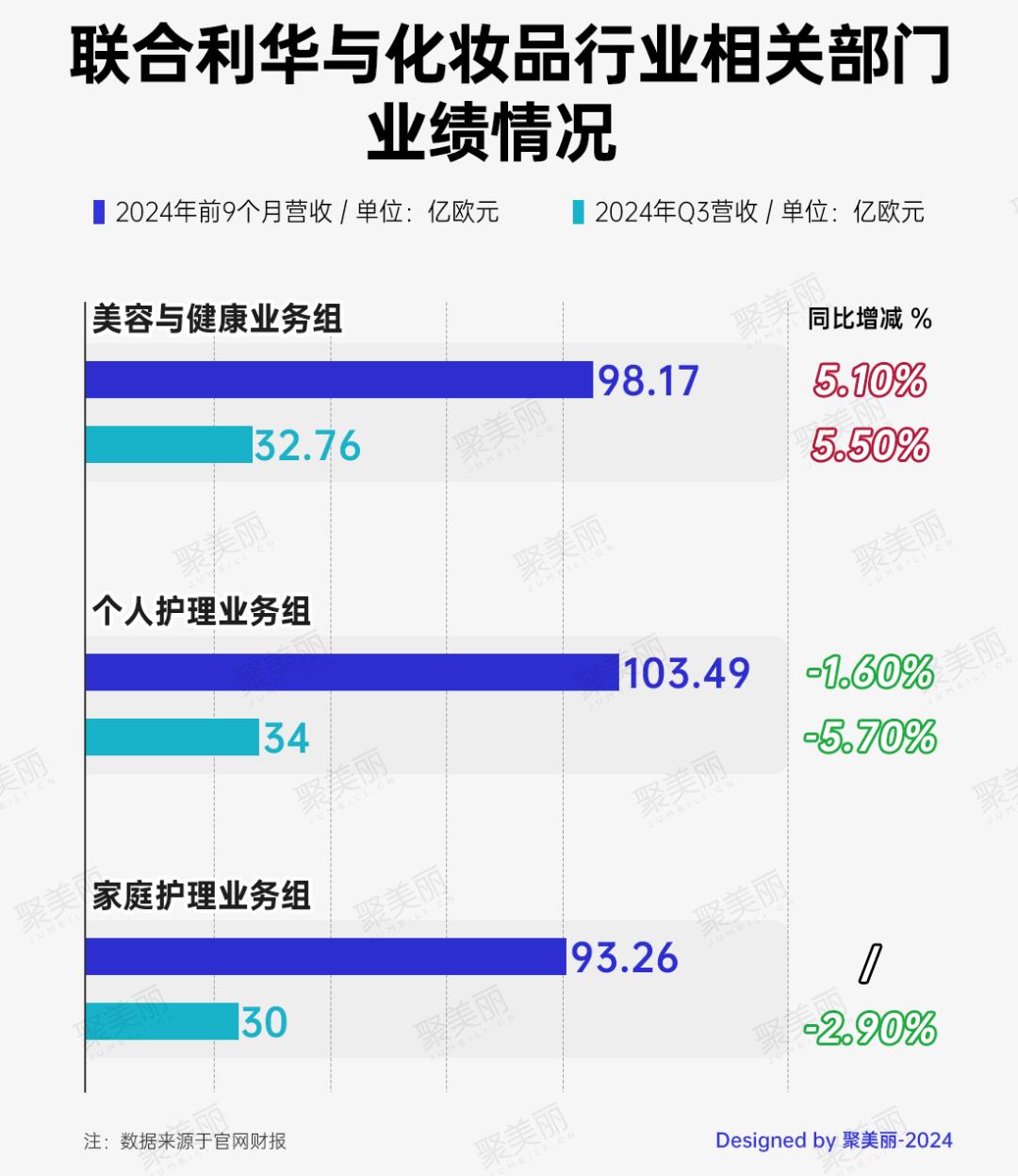 2024年前9个月个人护理业务组营收下滑1.6%、Q3下降5.7%;家庭护理业务组营收与去年同期相比,变动不大为93.25亿欧元(约合人民币715.92亿元),而Q3下滑2.9%。