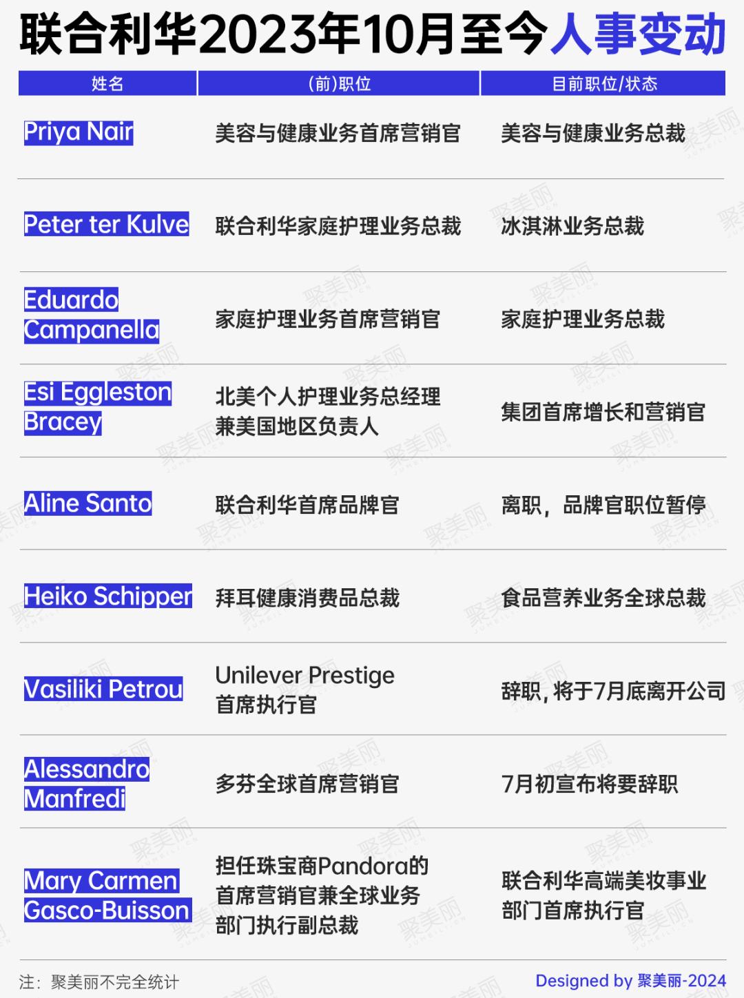与此同时,管理团队的革新也在同步进行。据聚美丽不完全统计,自2023年10月以来,联合利华至少发生了9起重要的人事变动,其中涉及首席执行官、美容与健康业务总裁、家庭护理业务总裁、高端美妆事业部首席执行官等重要职位。