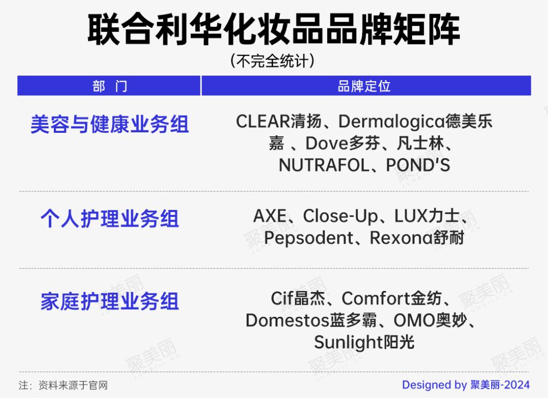 目前,联合利华旗下有五大业务板块,其中,美容与健康业务组、个人护理业务组和家庭护理业务组和化妆品行业关联性较强。