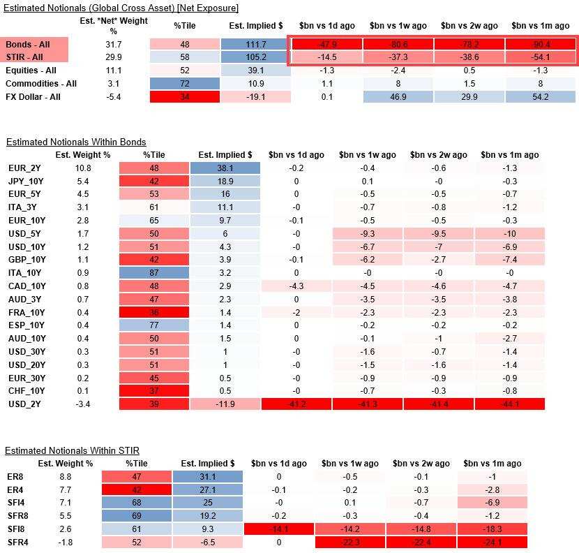 债券和STIRS中仍存在一个持续去杠杆风险的传统多仓,它依然来自系统趋势/ CTA 管理期货领域。野村估算,该领域过去一个月抛售的G10国家国债规模约为900亿美元,STIRS的抛售规模约 540亿美元。