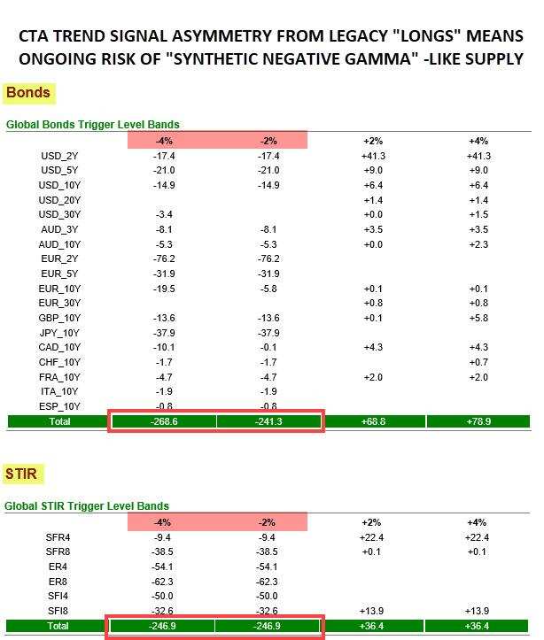 目前,野村认为仍严重偏向进一步的“供应”风险,期货有下跌2%的波动风险。野村估算,在出现进一步抛售催化剂的情况下、即的抛售越多、债券/STIRS价格越低系统的负Gamma情况,可能还有2410亿美元的债券和2470亿美元的STIRS被抛售。